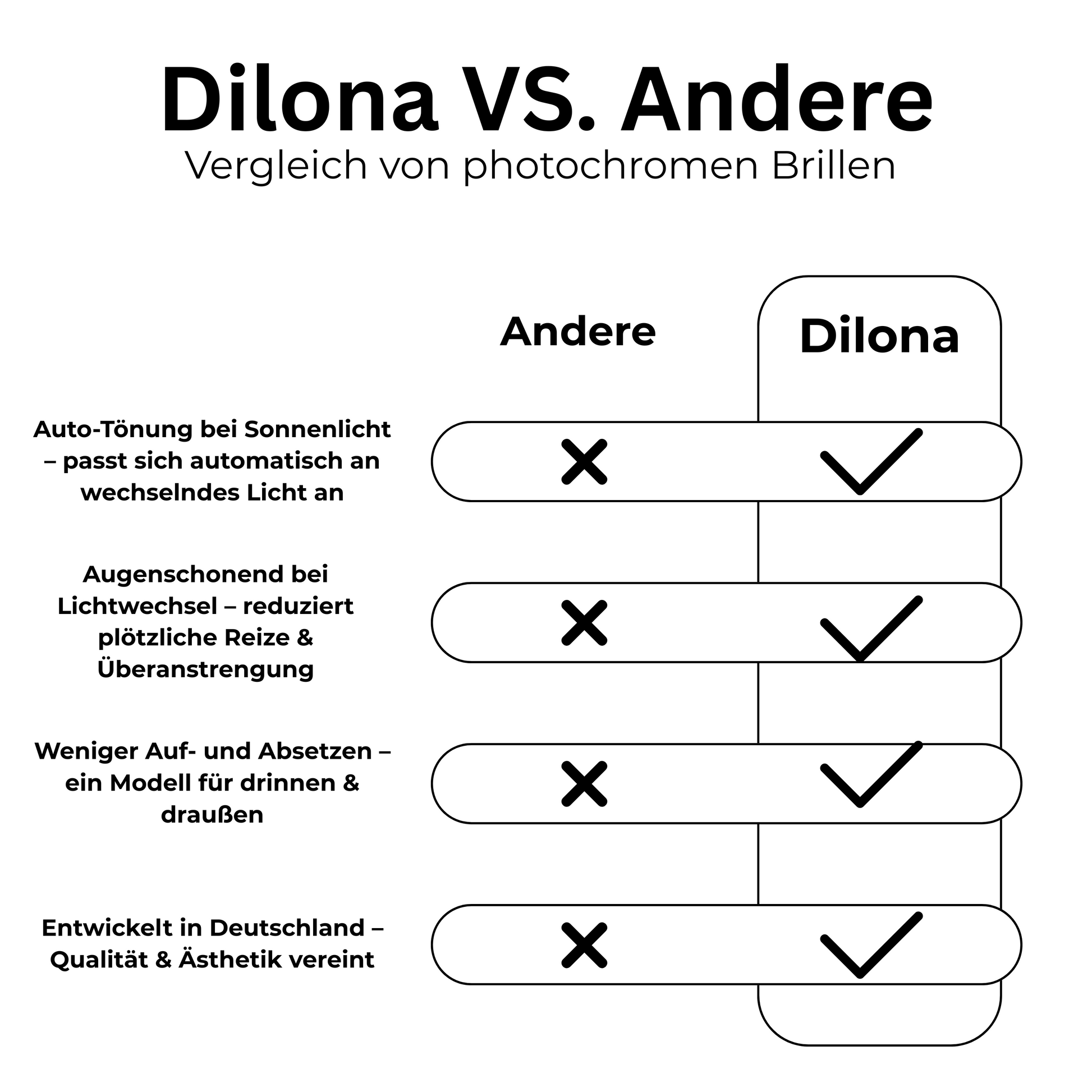 Dilona Brillen lösen genau dieses Problem – mit modernster photochromer Technologie, die sich automatisch an das Licht anpasst. Kein Auf- und Absetzen mehr. Kein Blenden. Keine Kompromisse.